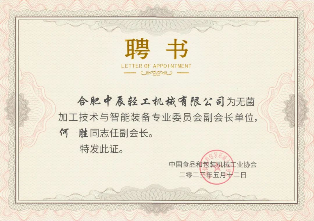 Zhongchen Light Machinery was elected as the vice president unit of the Specialized Committee on Aseptic Processing Technology and Intelligent Equipment.